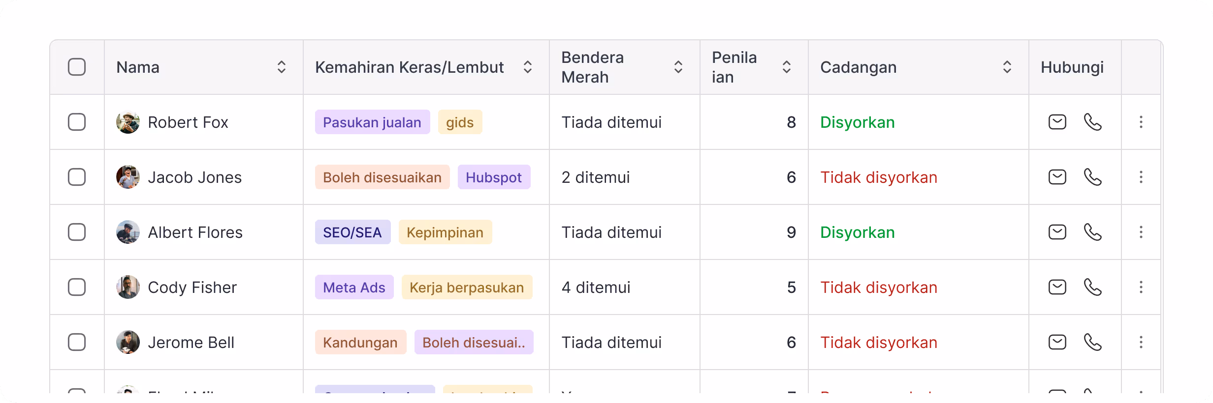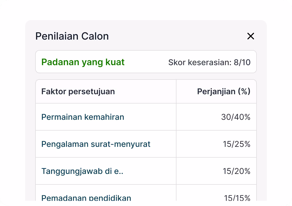 Skor dan pandangan berkuasa AI yang membantu anda mengenal pasti calon terbaik dengan lebih pantas. Sesuaikan jadual saringan anda dengan pandangan yang anda dapati penting.