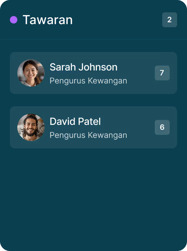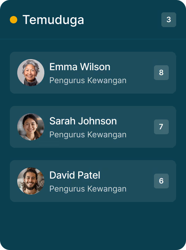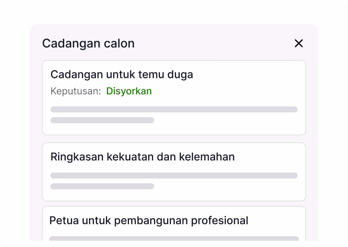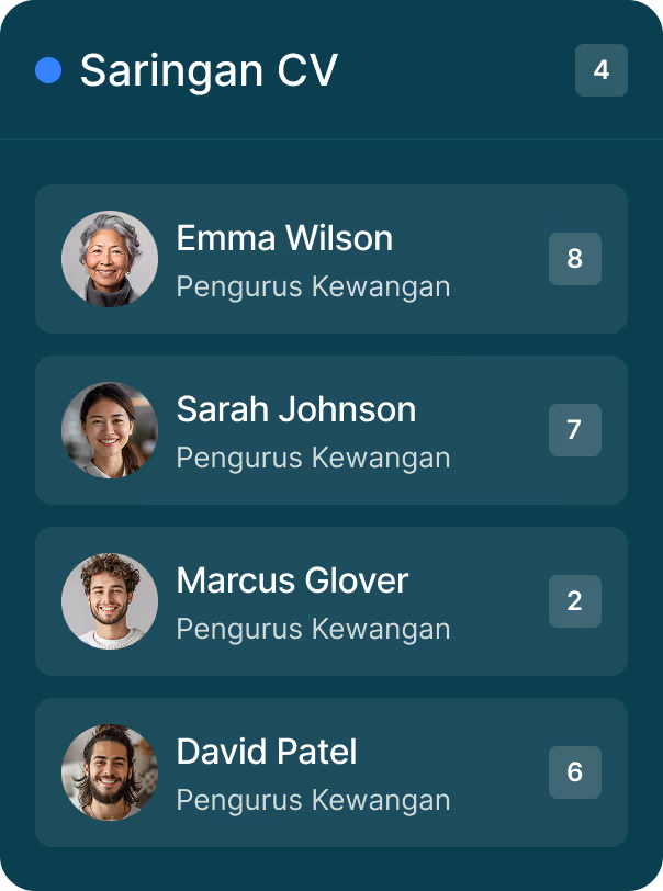 Dapatkan senarai pendek segera yang dikuasakan oleh analisis AI yang mendalam dan fokus pada temu duga, bukan saringan manual. Upah dengan lebih baik, lebih pantas.