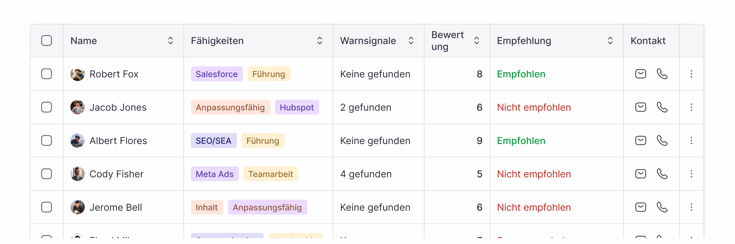 KI-gestützte Bewertungen und Analysen helfen Ihnen, die besten Kandidaten schneller zu identifizieren. Passen Sie Ihre Auswahltabelle mit den für Sie wichtigen Erkenntnissen individuell an.