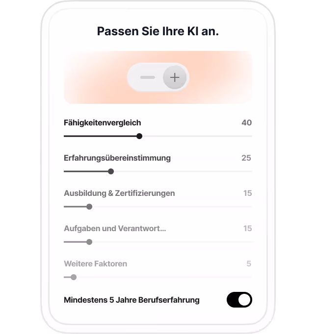 Erhalten Sie sofort eine Vorauswahl dank umfassender KI-Analyse und konzentrieren Sie sich auf Vorstellungsgespräche statt auf manuelle Vorauswahl. Stellen Sie bessere Kandidaten schneller ein.