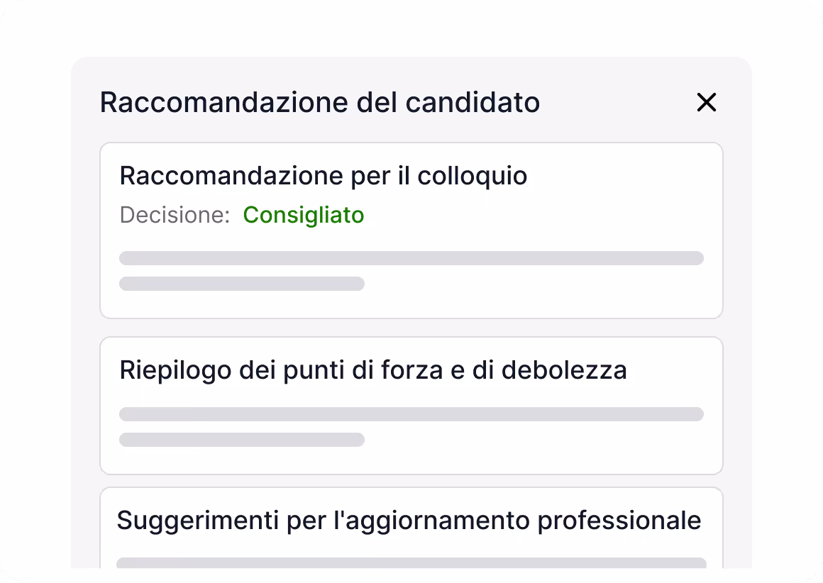 Ottieni una rosa di candidati istantanea basata su un'analisi approfondita dell'intelligenza artificiale e concentrati sui colloqui, non sullo screening manuale. Assumi meglio, più velocemente.