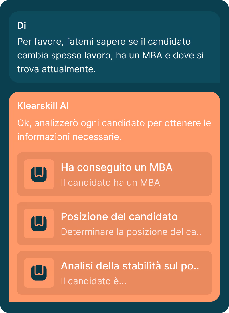 Klearskill analizza ogni candidato, evidenzia i rischi e i punti di forza nascosti e ti aiuta a prendere decisioni migliori in materia di assunzioni.