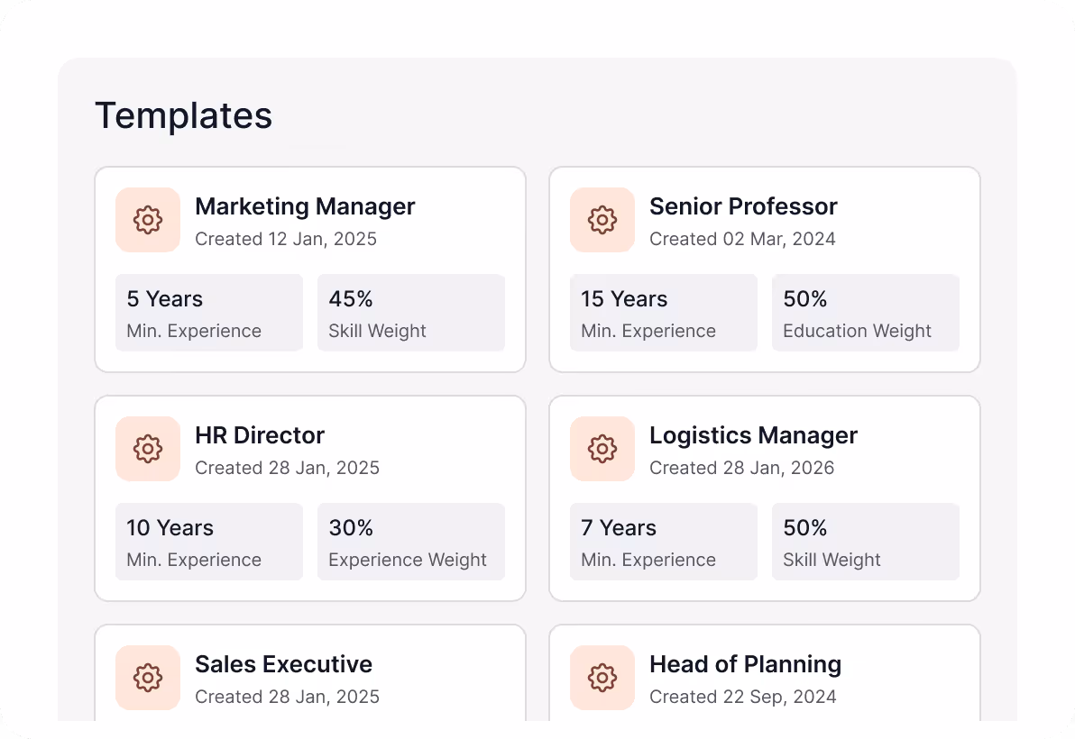 Define how the AI evaluates candidates, save preferences as reusable templates, and apply them per job to get role-specific candidate scores.