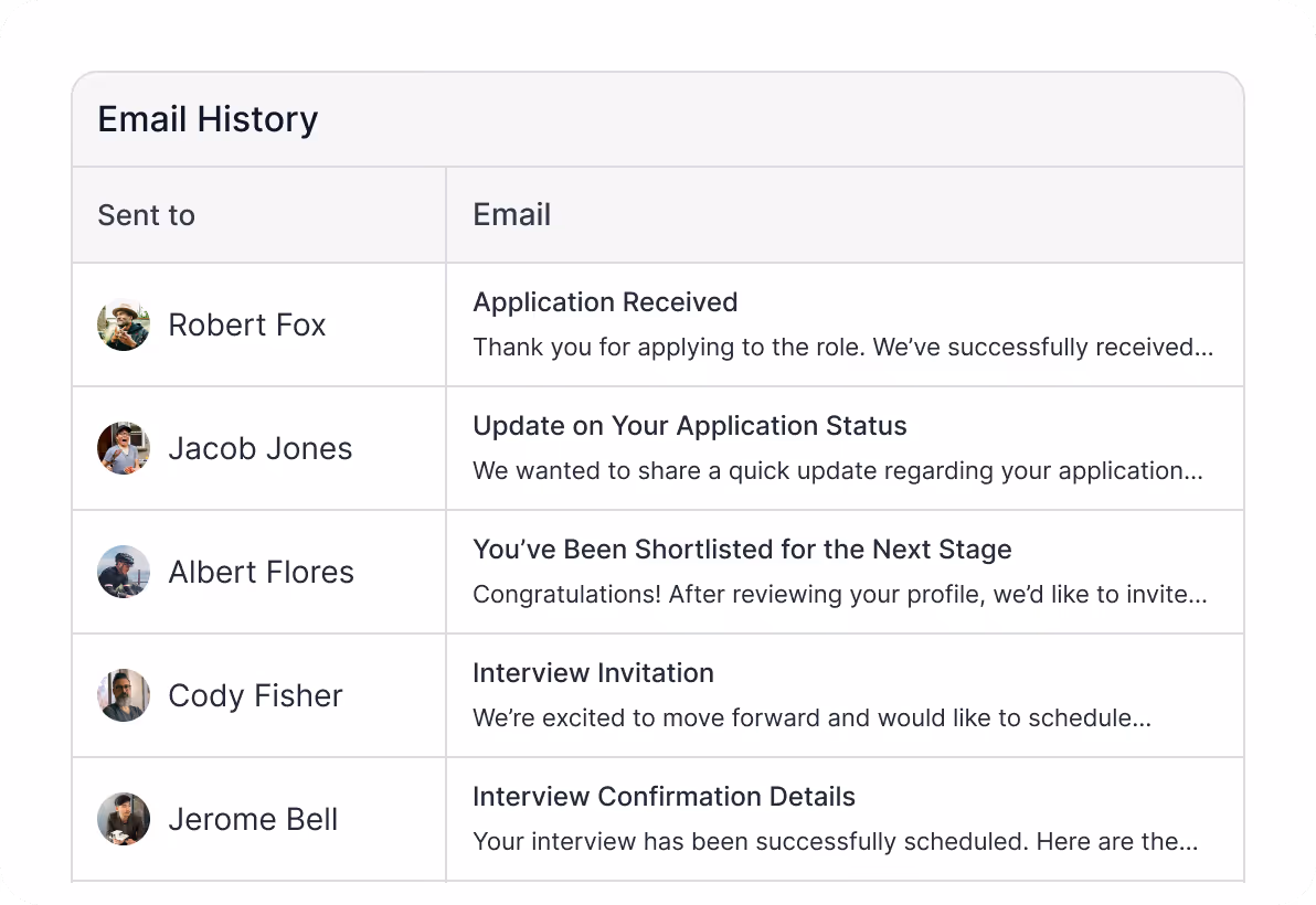Maintain brand consistency, improve email deliverability, and keep all communication centralized within your hiring workflow without switching between tools.